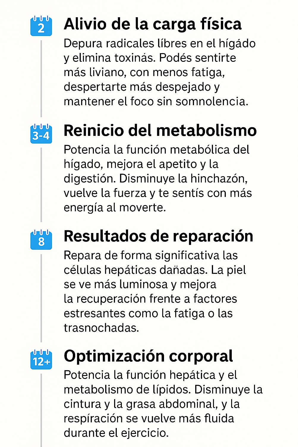 Notó bienestar digestivo sostenido: menos hinchazón y mejor tolerancia a comidas pesadas desde la semana 2–4.